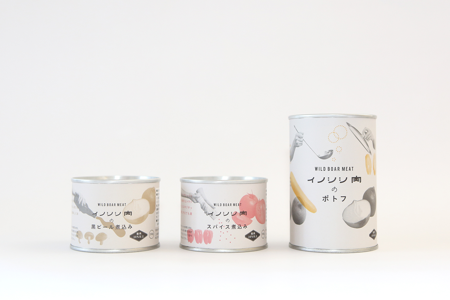 バウムではパッケージデザイン、コピーライティングを含めたブランディング担当しました。あえてイノシシの要素は文字で入れるのみにとどめ、野菜などの食材や調理のシーンをキービジュアルにすることで、ジビエ肉に馴染みのない方も手に取りやすいデザインにまとめました。缶詰の中身が見えなくてもイメージが湧き食欲をそそるよう、味や風味、食べ方のアレンジを具体的に説明しました。