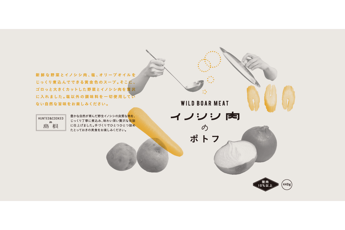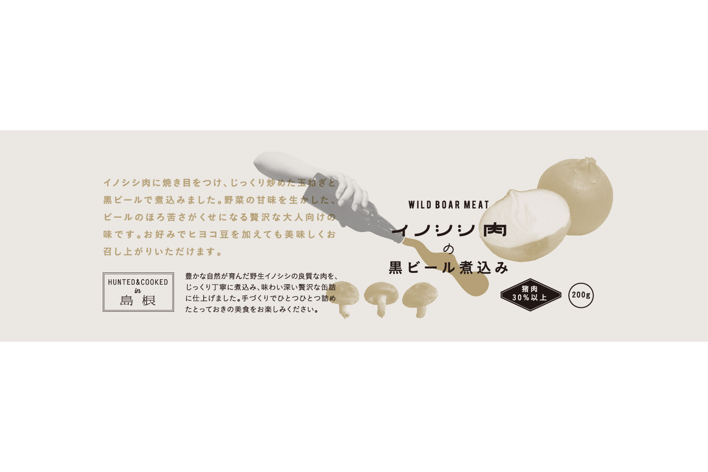 ときに森や田畑を荒らす害獣として疎まれる存在のイノシシを、山の恵みとしておいしくいただこうという考えのもと、島根県美郷町で捕らえられた良質なイノシシ肉を丁寧に調理し缶詰に。
